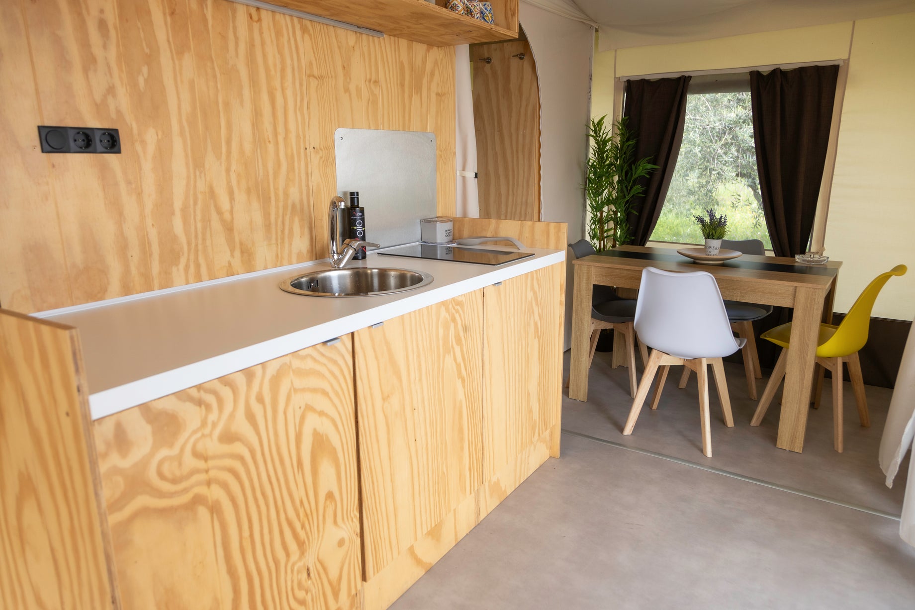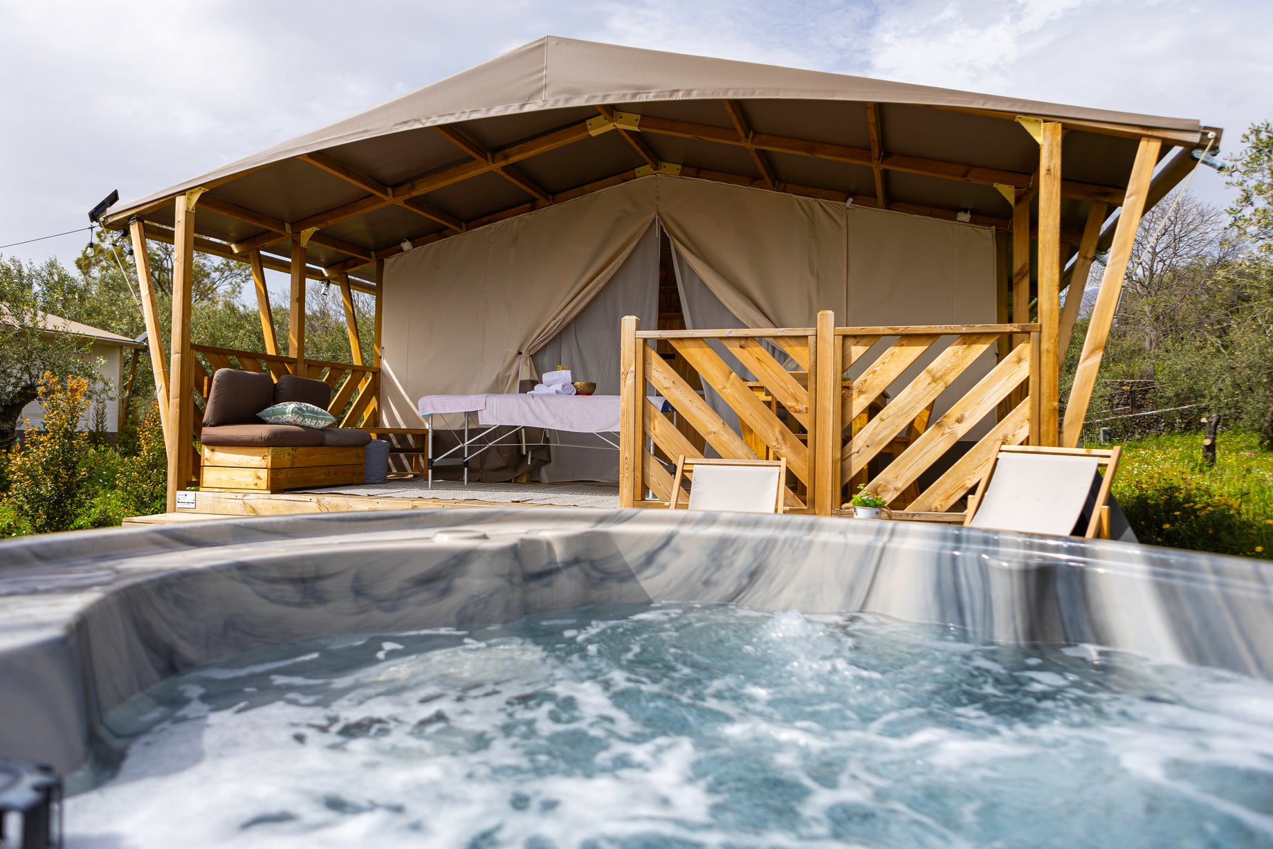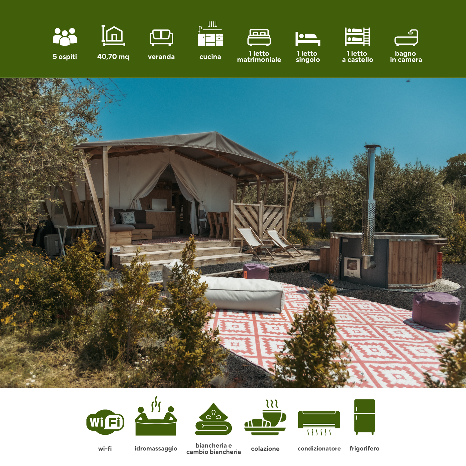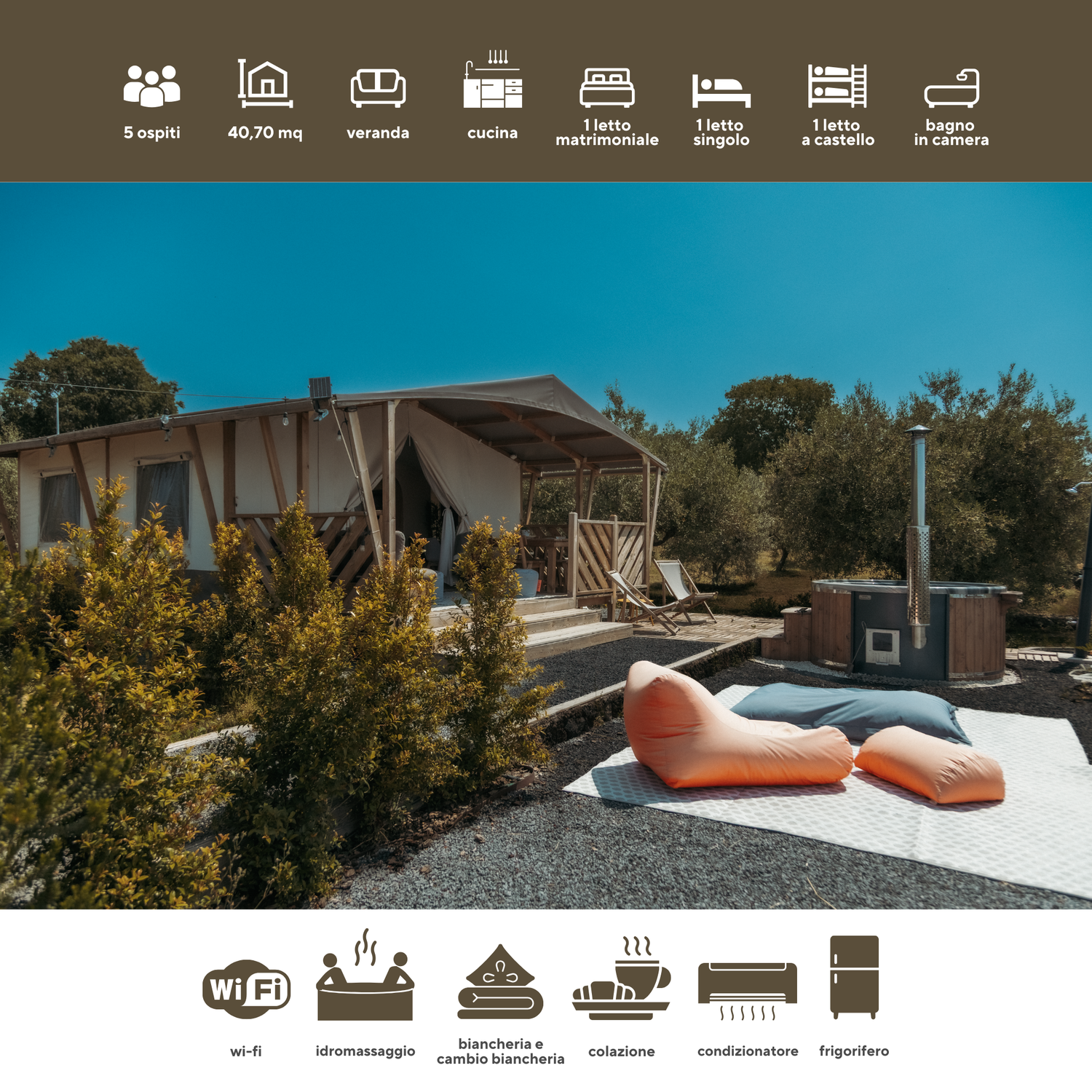 Elevate la vostra esperienza di soggiorno con la Lodge Aria. Caratterizzata da un design aereo e leggero, questa Lodge offre una prospettiva unica sul paesaggio. L'idromassaggio con vista panoramica è il luogo ideale per rilassarsi dopo una giornata di esplorazione delle bellezze naturali e culturali della regione.